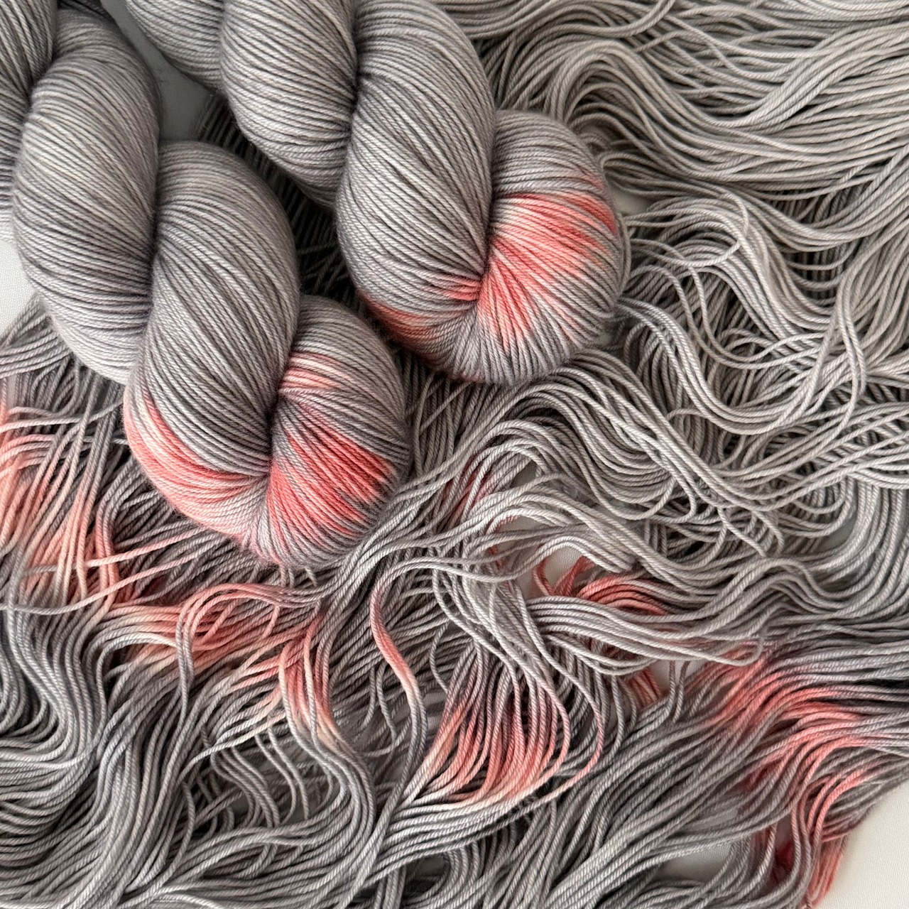 毛糸は手染めのため、同じタイミングで染色された毛糸、再販商品でも、かせごとに色の入り方が違っています。