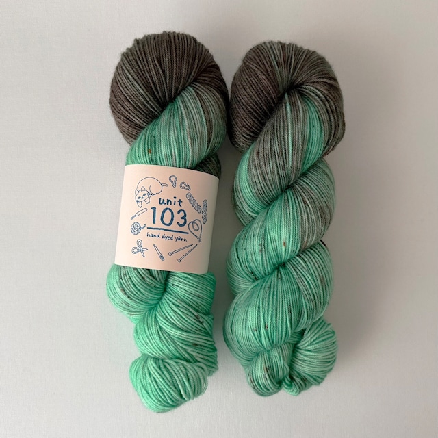 【アーカイブ】について 過去に販売された毛糸の記録として残しています。 物語などお楽しみいただけると嬉しいです。 Lucy(ルーシー)2026年2月 「さっきから騒がしいわね。なにをしてるの?」 ママがキッチンに来ちゃった。 できることなら、全部ひとりでやりたかったけど、 料理なんてほとんどやったことがない。 お菓子作りなんて、もちろん初めてだ。 だからこそ、人生経験として、一度はやっておくべきでしょう? お菓子作りの本を買って勉強してみたり、 動画を見て研究してみたりもしたけど、 どうやら私には向いていないみたい。 時々、パパのわけのわからない実験の手伝いをしているし、 お菓子作りだって余裕だと思ったんだけど、 化学実験とお菓子作りは、似て非なるものらしい。 まあ、挑戦しようとした気持ちが大切ってことで、 手伝ってもらうことにしよう。 私がお願いすると、 「仕方がないわねー」って、 何を勘違いしているのか、にやにやしながら手伝ってくれた。 ママの参戦で、あっという間に完成した チョコミントタルトを、ふたりで試食する。 んー!! おいしい! ほとんどママが作ったんだから当然か。 でも、挑戦したってことが大事だしね。 あとでパパの研究所にも届けに行こう。 fingering superwash fine merino 80% nylon 20% weight 約100g/400m 肌にやさしい柔らかさと、しっかりとした耐久性を兼ね備えた糸です。 デイリーに使える靴下やショール、日常に寄り添うアイテム作りにおすすめ。 ※なるべく実際の色味の見え方に近くなるよう撮影していますが、ご使用のモニターによって色の見え方が違う事がございます。 手染め毛糸についてのご案内 1. 色の染まり方について 毛糸は手染めのため、同じタイミングで染色された毛糸、再販商品でも、かせごとに色の入り方が違っています。 数かせ使われる場合は、色のつながりを自然にするために、2かせを交互に編んでいただくのがおすすめです。 また、製造工程上1〜2箇所の結び目がある場合があります。あらかじめご了承ください。 2. 色移り・色落ちについて できる限りしっかりと定着処理をしていますが、濃い色やスペックル部分などは、まれに色がにじむことがあります。 特に最初のお洗濯では、単独でやさしく洗っていただくと安心です。 色落ちによる返品はお受けしておりませんので、ご了承くださいませ。 3. お手入れについて この糸はスーパウォッシュ加工済みで、洗濯機も使えますが、長くきれいにお使いいただくには手洗い+平干しがおすすめです。 ウール洗剤や中性洗剤をつかい、水かぬるま湯で手洗いしてください。手洗い後はタオルなどに包んでやさしく押して脱水し、直射日光のあたらない風通しのよい場所に平置きにして陰干ししてください。 4. 保管について 毛糸は直射日光や湿気が苦手です。 日の当たらない、風通しのよいところで保管していただくと、色合いも長持ちします。 長期保存には、防虫剤を添えて袋に入れておくのも安心です。